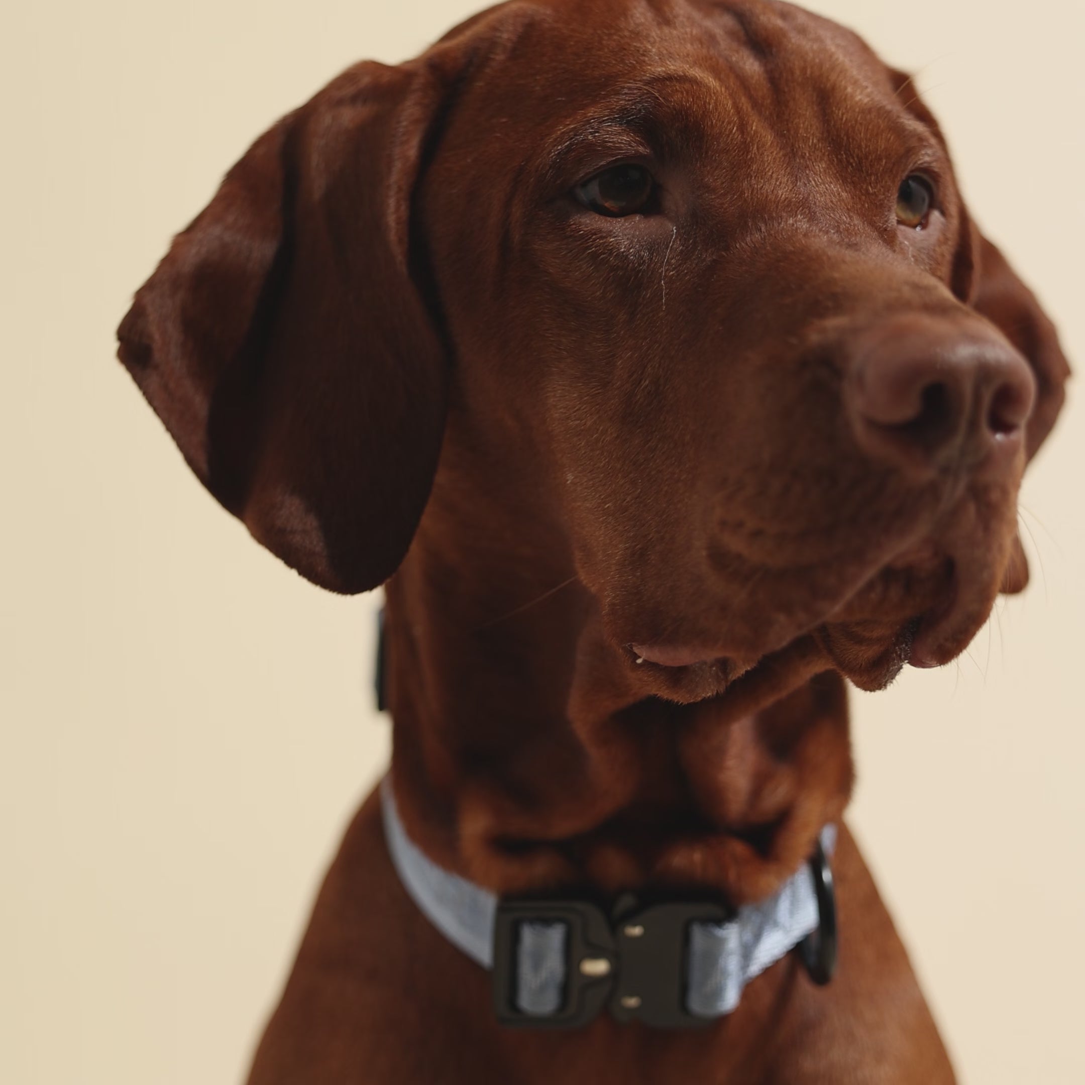 High-quality blue jacquard dog collar made of woven nylon with ultra-light aluminum click fastener and infinitely adjustable.