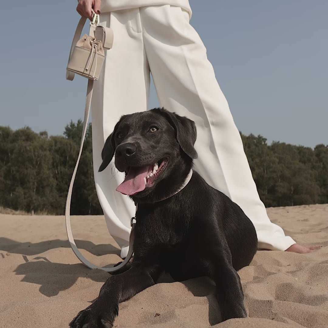 Correa para perro de cuero liso elaborada a mano en un cálido y suave color beige con herrajes de latón dorado. Disponible en dos diseños y dos tamaños para perros pequeños y grandes.