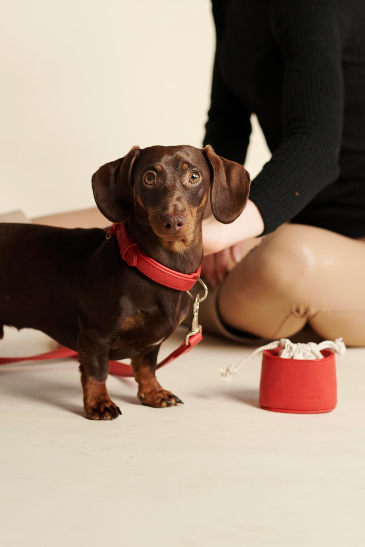 Poodle trägt ein Charles Lederhalsband in braun, blau und rot, eine Frau daneben trägt eine Hundeleine und einen Leckerlibeutel aus Leder in braun, rot und blau