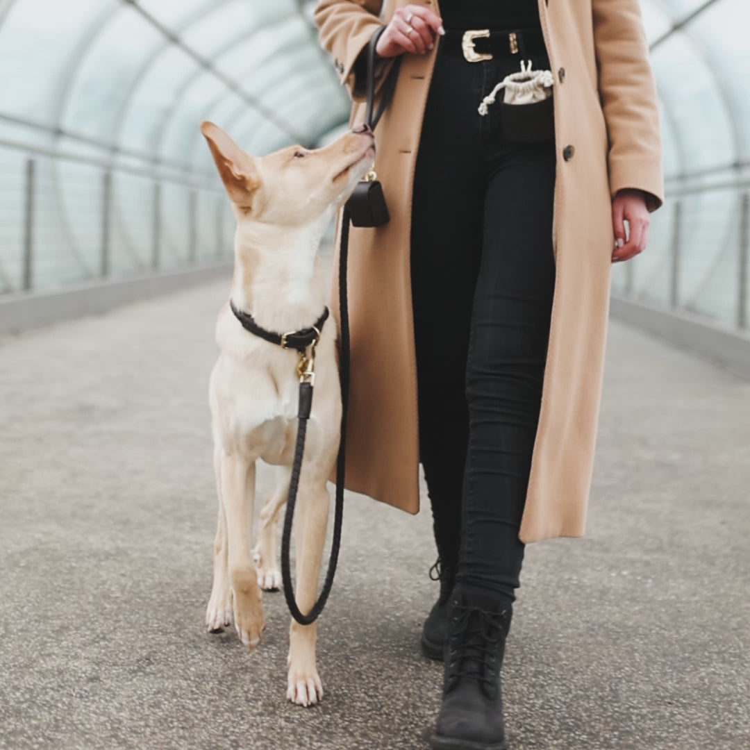 Mi piace molto la tecnica dell'intreccio! Non solo il guinzaglio è estremamente elegante e di alta qualità, ma anche il colore si abbina perfettamente al cappotto di Bounty.