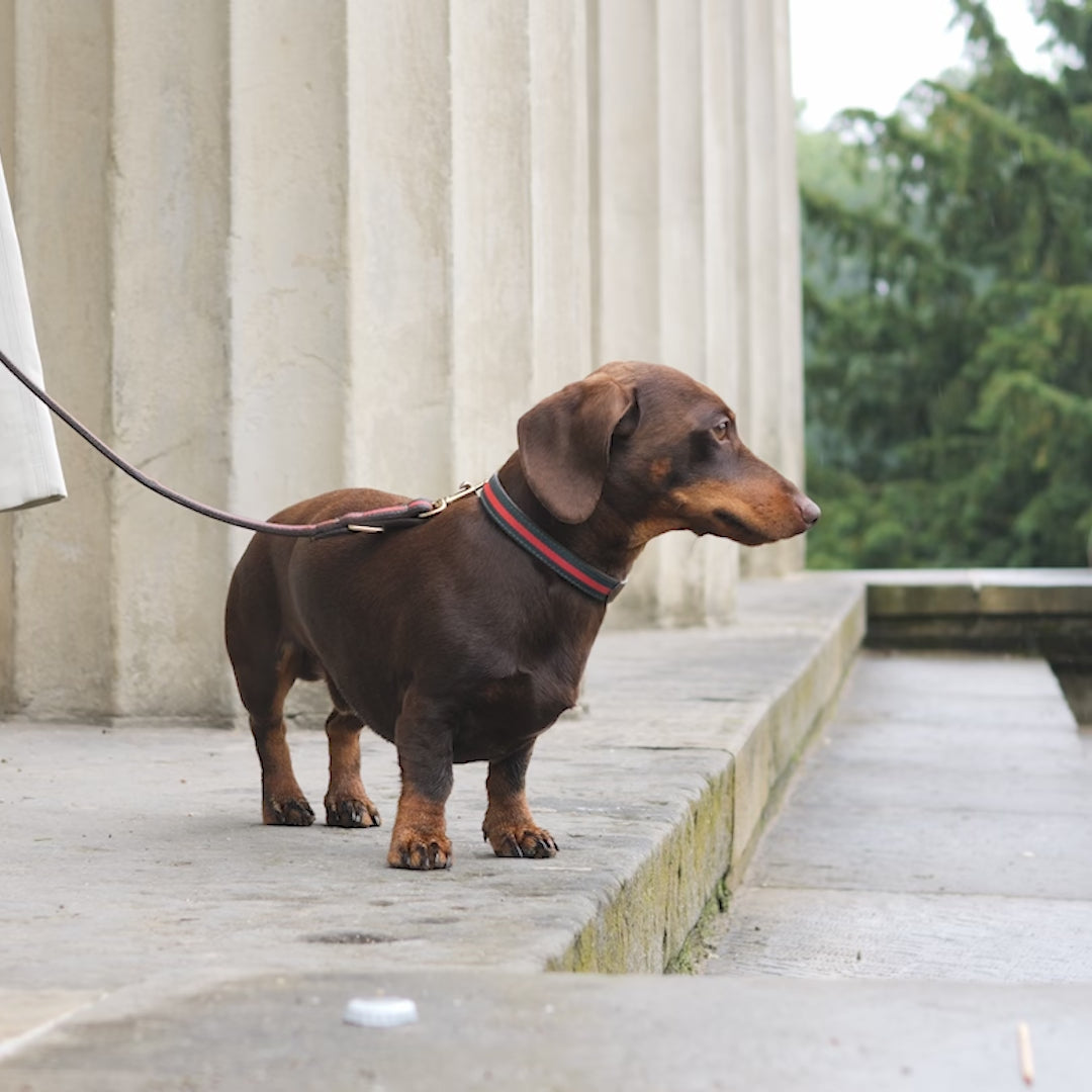Guinzaglio in cuoio di alta qualità con finiture in ottone e strisce decorative in tela rossa e verde. Per cani grandi e piccoli.