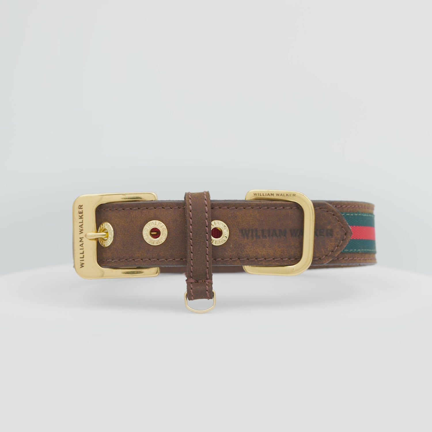 Hochwertiges Lederhalsband mit Messingbeschlägen und rot-grünen dekorativen Canvas-Streifen. Für große und kleine Hunde.