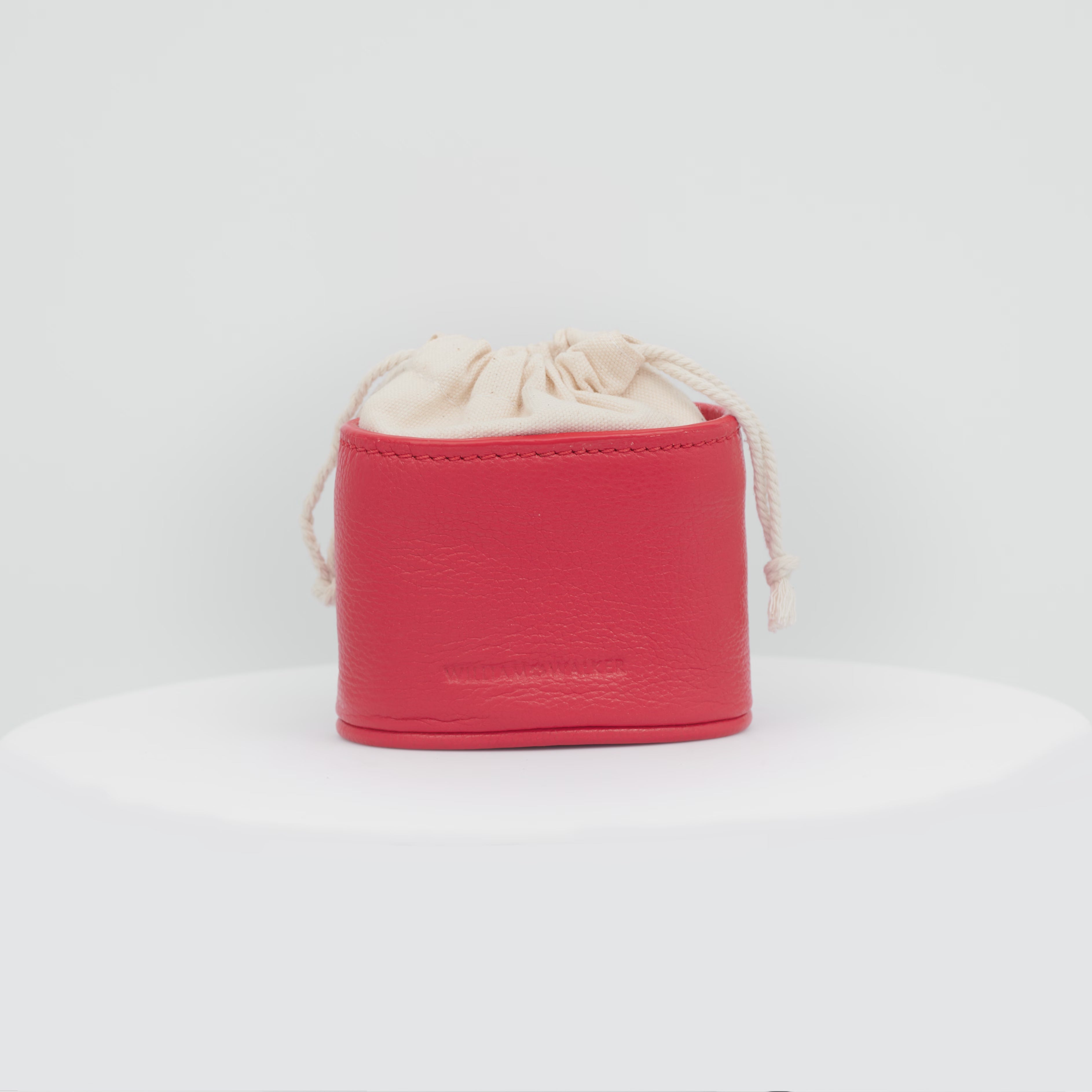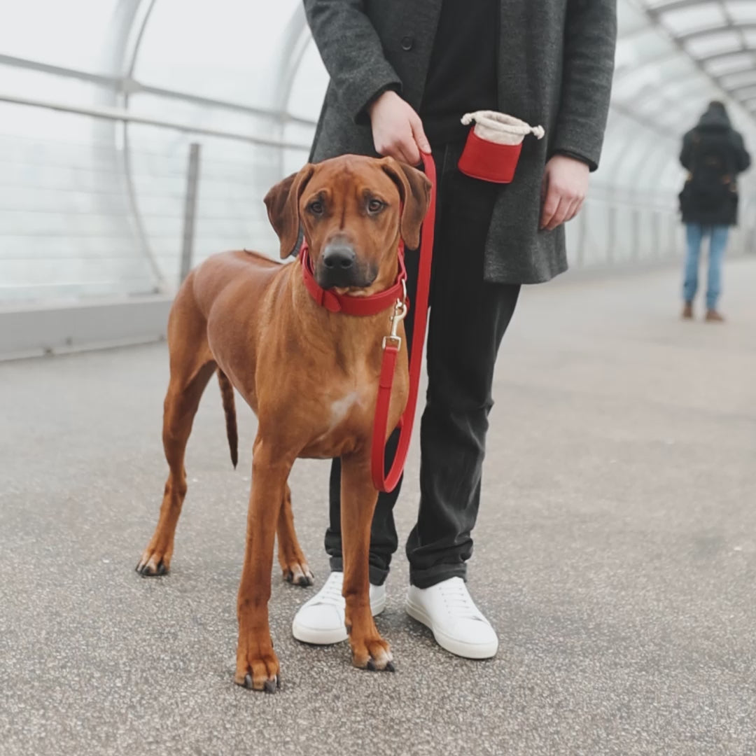 Hochwertiger Leckerlibeutel aus rotem Leder mit praktischen Anbringungsmöglichkeiten für stilvolles Hundetraining.